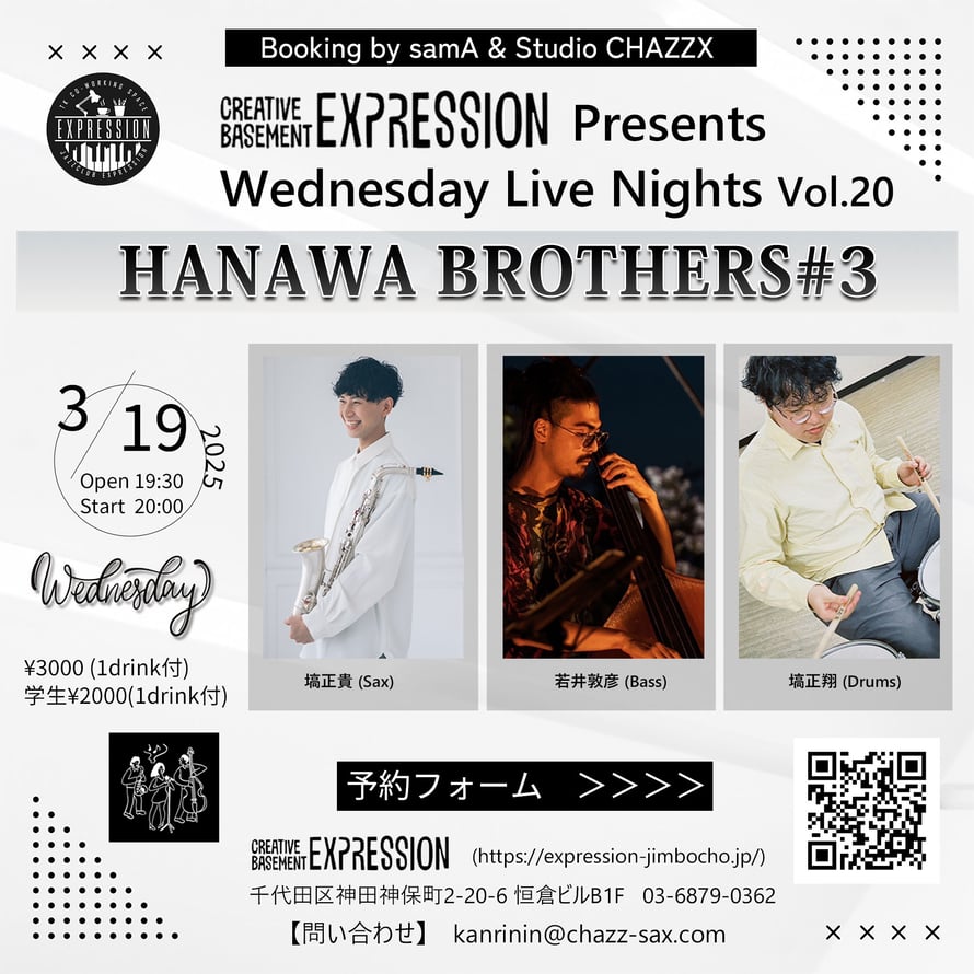 Live Schedule 3/19(水) 〈Booking by samA & Studio CHAZZX〉 Expression Presents Wednesday Live Nights Vol.20 「HANAWA BROTHERS #3」 【場所】 神保町 EXPRESSION (千代田区神田神保町2-20-6 恒倉ビルB1F) (03-6879-0362) 【時間】 Open 19:30 Start 20:00 〜 (22:00 終了予定) 【料金】 ¥3000 (1drink付) 学生 ¥2000 (1drink付) 【出演】 塙正貴 (Sax) 若井敦彦 (Bass) 塙正翔 (Drums) 【予約フォーム】 https://forms.gle/qNa7AUenAx5Xj1fH8 【問い合わせ】 kanrinin@chazz-sax.com tagPlaceholderカテゴリ:
