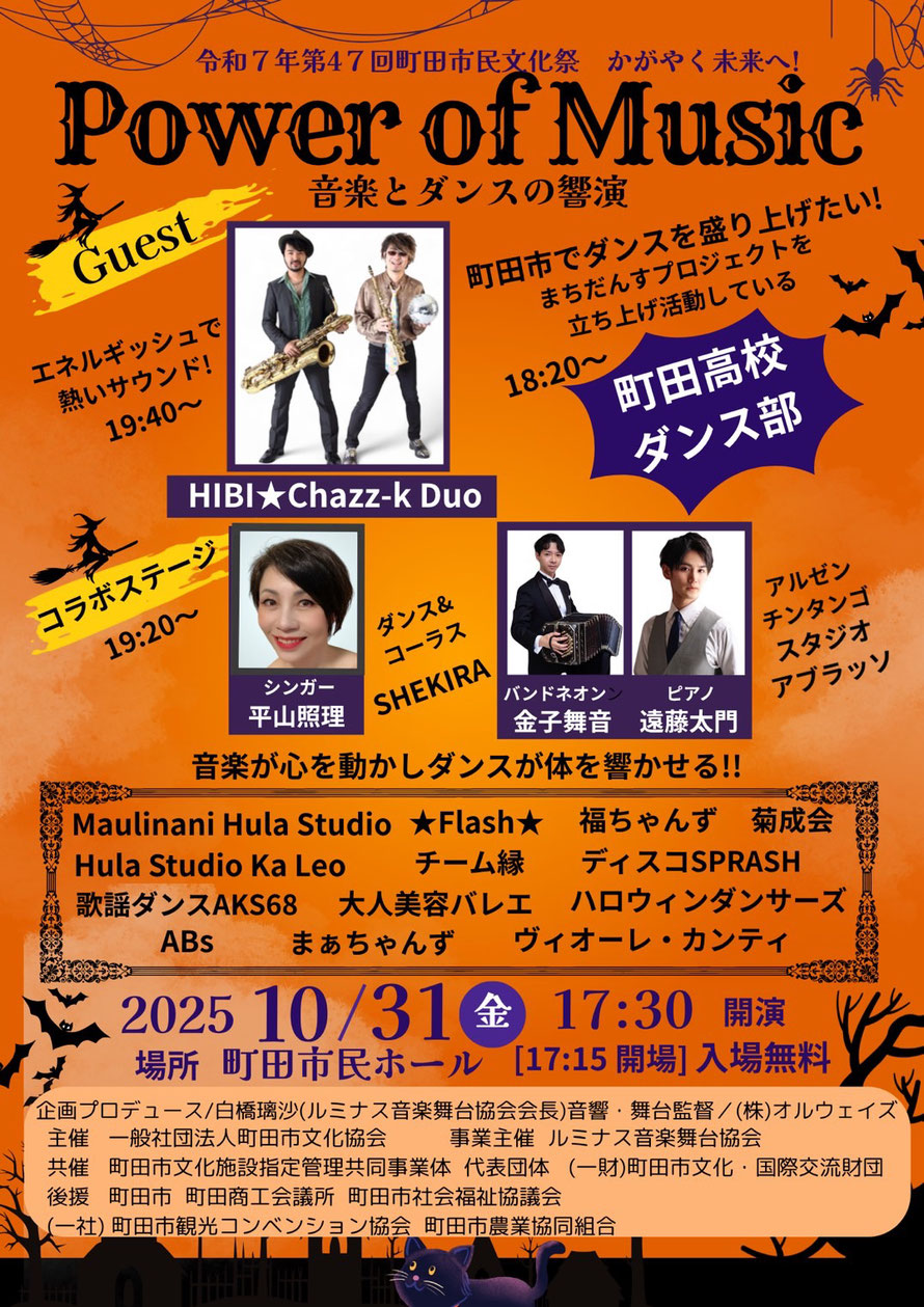 Live Schedule 10/31(金) 「第47回 町田市民文化祭 かがやく未来へ! Power of Music 音楽とダンスの響演」 【場所】 町田市民ホール https://www.m-shimin-hall.jp/ (小田急線町田駅 西口 徒歩7分・JR横浜線町田駅 中央改札口 北口 徒歩10分) 【日時】 10月31日(金) 17:15 開場 17:30 開演 19:40〜19:50 出演 【料金】 入場無料 【出演】 ・HIBI★Chazz-K 2 ひび則彦(ss) 小仲井紀彦(bs) エネルギッシュで熱いサウンドをお送りします! tagPlaceholderカテゴリ:
