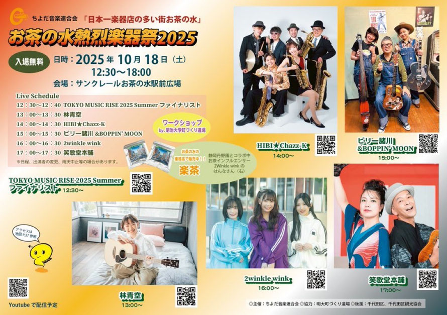 【場所】 駒沢オリンピック公園総合運動場 https://www.tef.or.jp/kopgp/index.html 【日時】 10月13日(月・祝) 12:30〜13:00 スマイルエリア(中央広場)メインステージ 【料金】 入場無料 【出演】 ・HIBI★Chazz-K ひび則彦(Ss) 染谷真衣(As) 井上雄哉(Ts) 小仲井紀彦(Bs) 竹下宗男(Ds) HIBI★Chazz-Kは中央広場のスマイルエリアにて演奏します! https://komasupo2025-official.com/