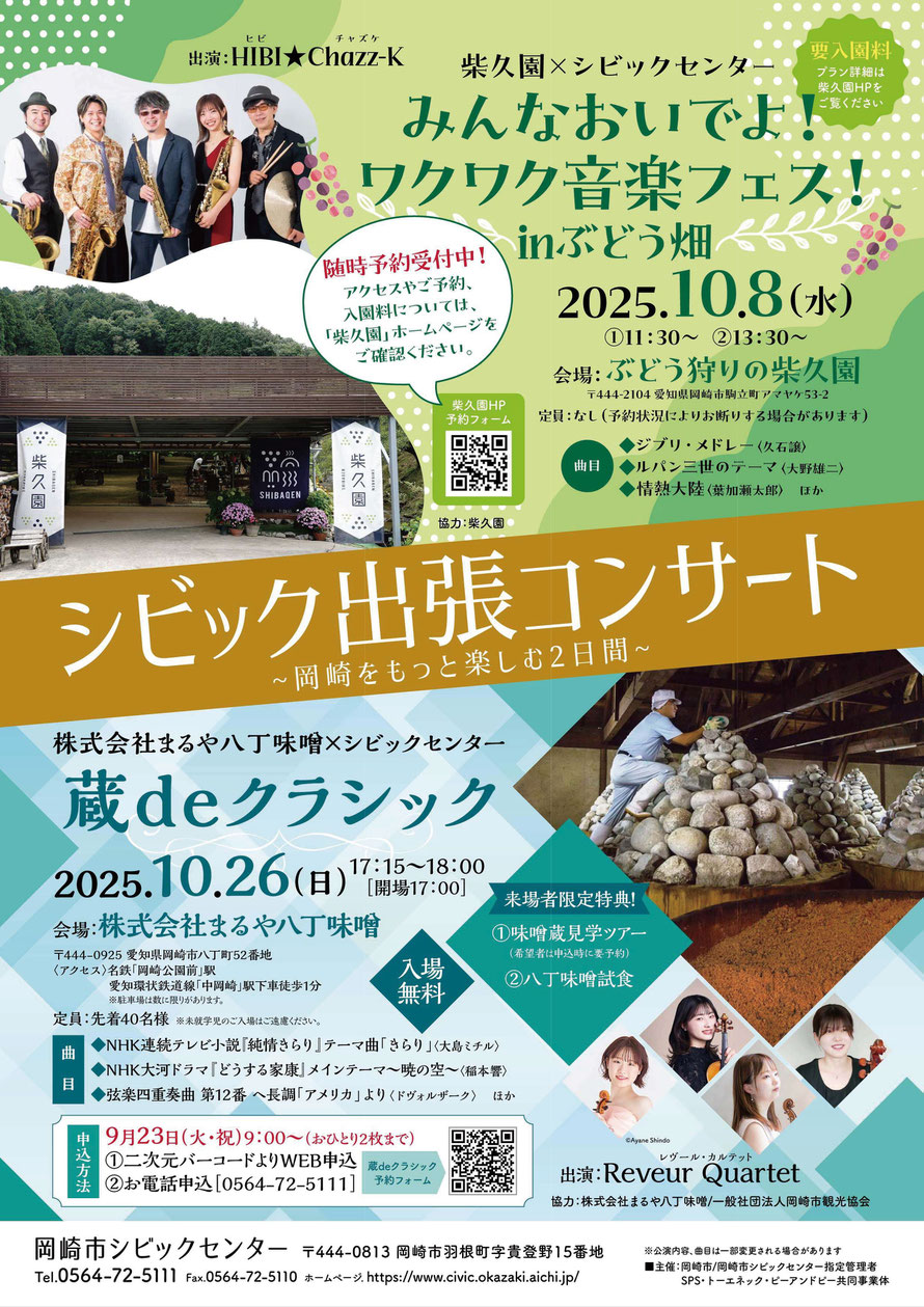 【場所】 ぶどう狩りの柴久園 https://shibaqen.com/ 【日時】 2025年10月8日(水) ①11:30〜 ②13:30〜 【料金】 要入園料 ※入園料のお支払いか、カフェの利用が必要になります。 ※プラン詳細、予約については柴久園のHPをご覧ください。 https://shibaqen.com/ 【出演】 ・HIBI★Chazz-K ひび則彦(ss) 染谷真衣(as) 井上雄哉(ts) 小仲井紀彦(bs) 竹下宗男(d)...